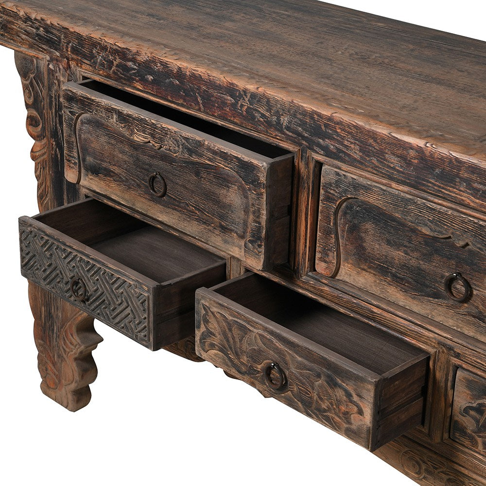 This beautifully carved old pine console table features seven spacious drawers accented with an elegant blackened finish, combining practicality with timeless charm. Its intricate detailing and generous size make it an exquisite centerpiece, perfect for enhancing a grand entrance or living area while offering ample storage.