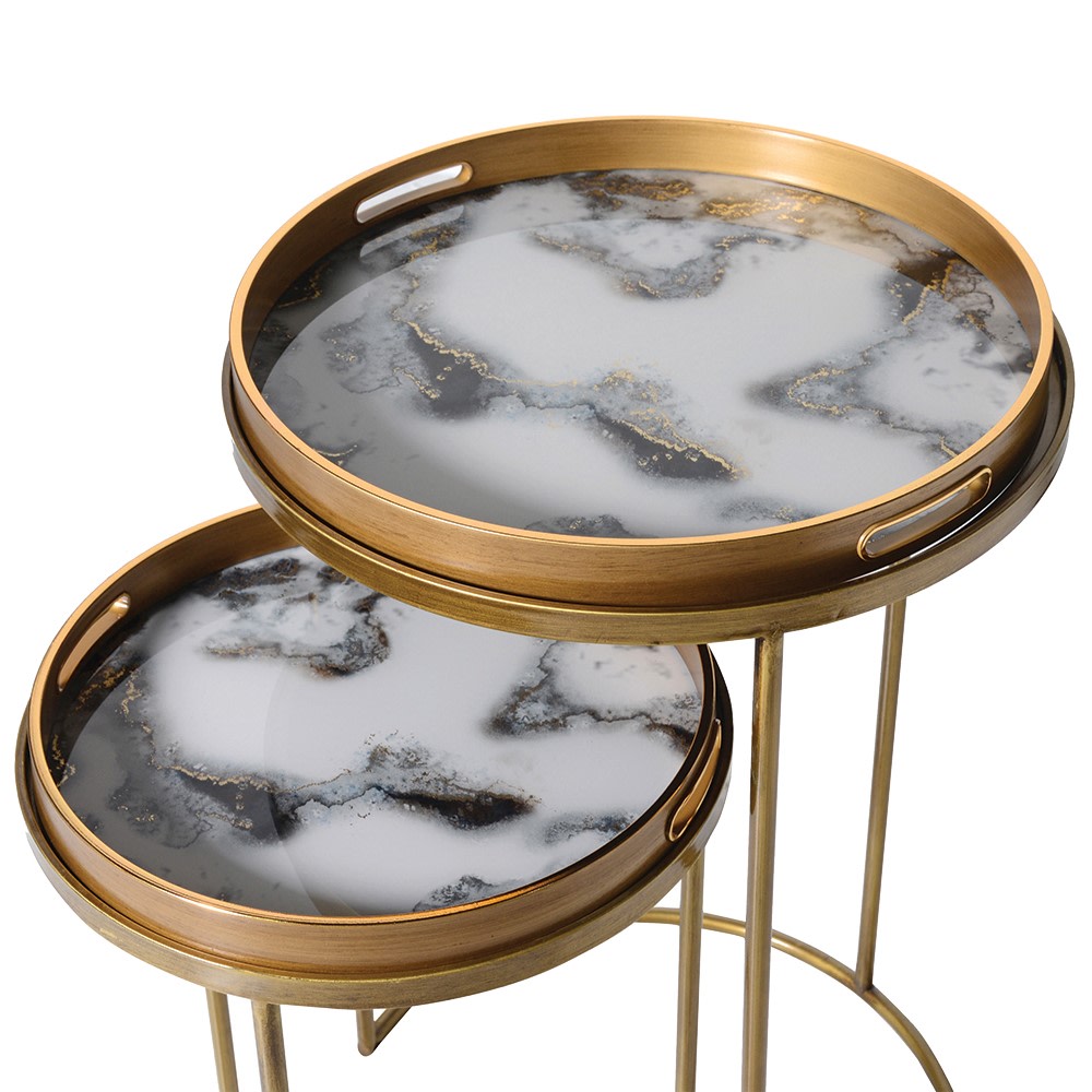 Elevate your living space with this sophisticated set of two marbled tray tables, featuring striking gold frames and removable trays. The white, grey, and gold marble-effect surfaces offer a refined touch, blending elegance with versatility. Perfect for serving or display, these tables provide a luxurious accent that complements a variety of interior styles.