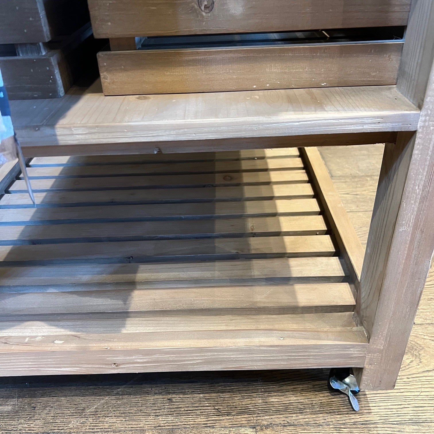 The unit has four drawers with stainless steel handles across the top, while four slatted wooden pull-out boxes (two each side) with an open area in the centre making a great storage shelf, The lower shelf offers storage solutions for the whole width of the unit.