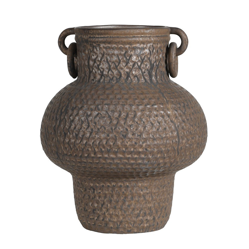 Crafted from fine porcelain, this Hammered Brown Vase combines the elegance of ceramics with the rugged charm of a hammered metal finish, featuring distinctive hoop handles on each side. Its textured finish and striking design make it a captivating centerpiece, perfect for showcasing faux flowers and enhancing any interior with a sophisticated, artisanal touch.