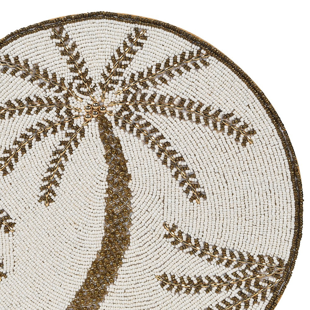 Elevate your table setting with this exquisite set of four beaded placemats, featuring an intricate palm tree design rendered in luxurious gold and cream tones. Each placemat showcases meticulous beadwork that catches the light beautifully, creating an understated yet sophisticated focal point for any dining occasion. Perfect for hosting dinner parties or everyday entertaining, these pieces combine artisanal craftsmanship with timeless elegance. The beaded detailing adds texture and visual interest whilst maintaining a refined aesthetic that complements both contemporary and traditional table décor. An investment in quality that transforms ordinary meals into memorable experiences.