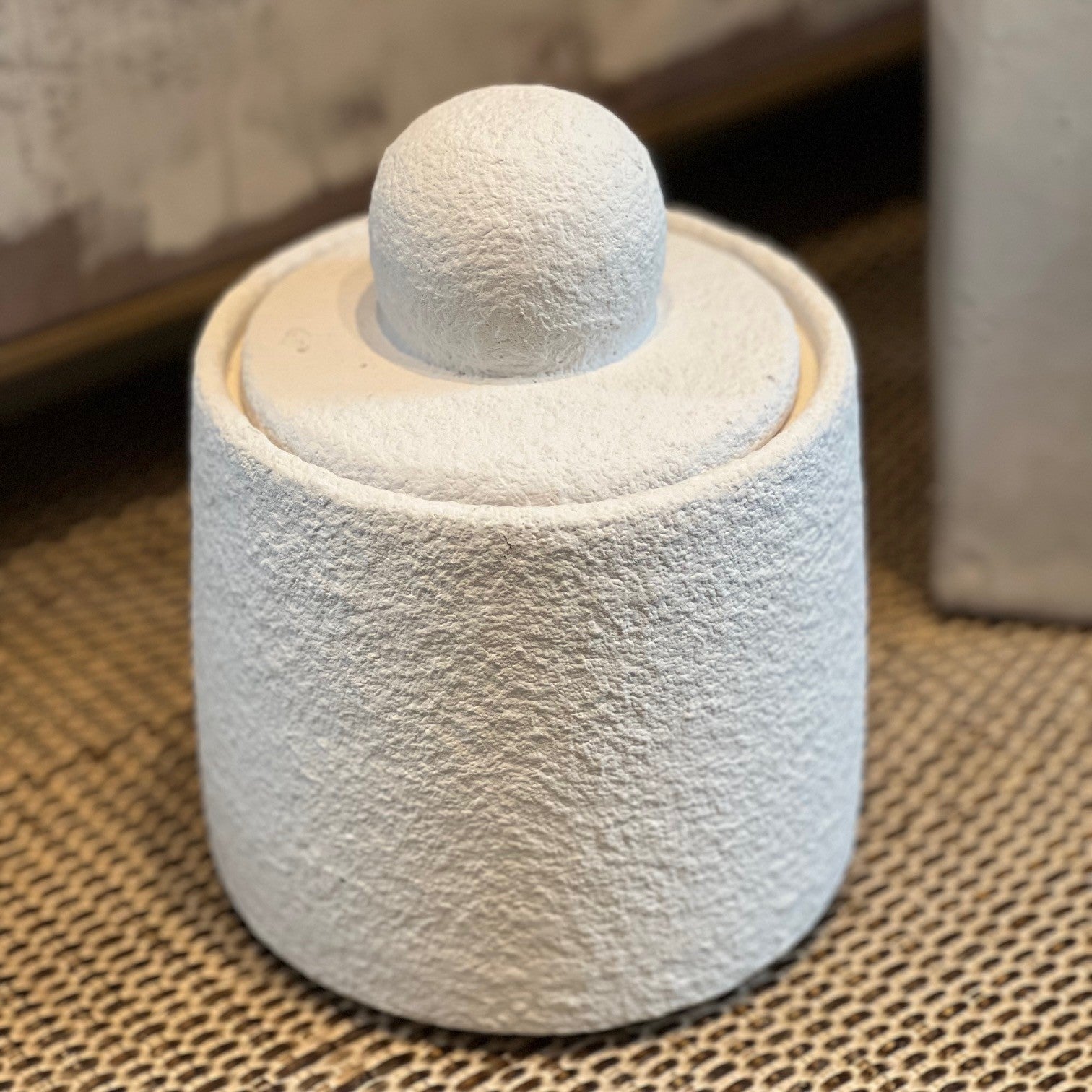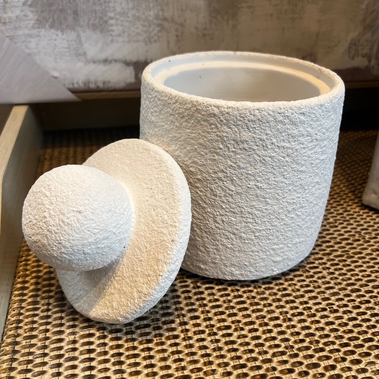 This small White Textured Jar serves as both a practical storage solution for small items and a stylish decor piece. Made from durable cement with an off white textured finish, it is both functional and visually appealing. Keep your space tidy and add an elegant touch with this versatile jar.